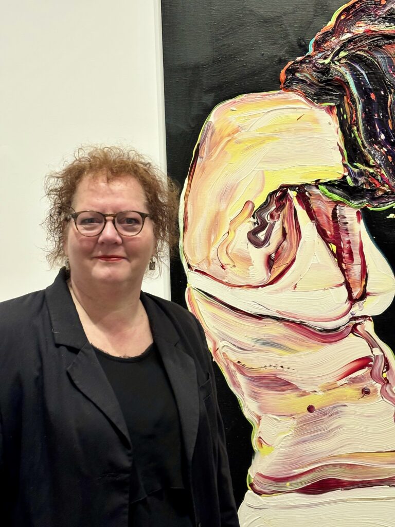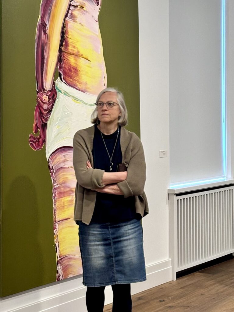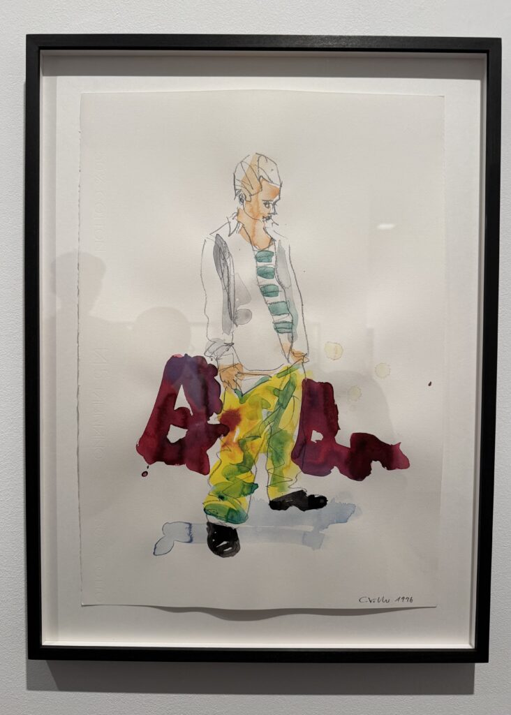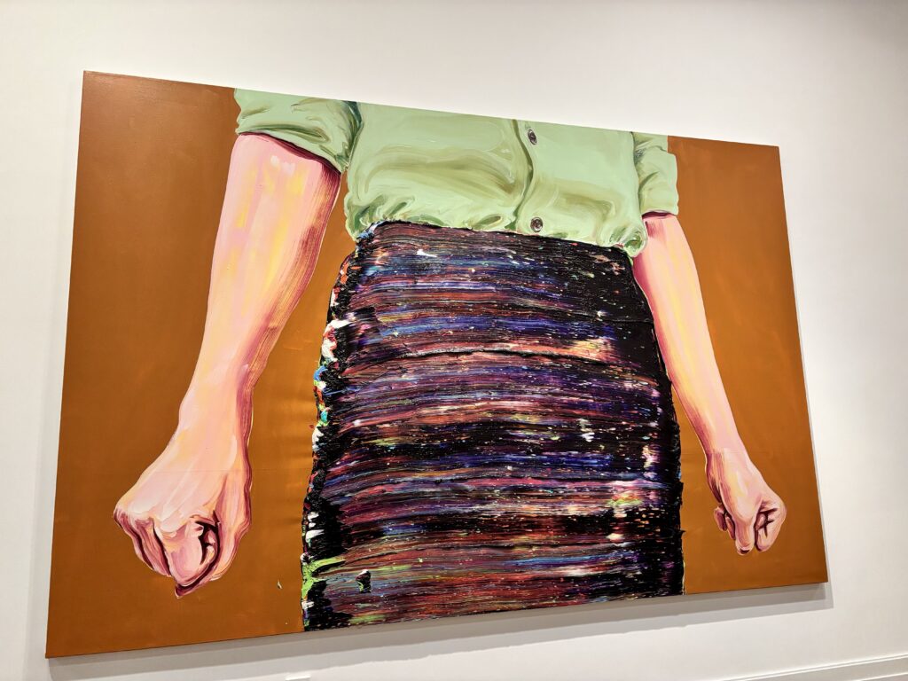 Doch „Stoff“ ist nicht nur thematisch präsent, sondern prägt auch Völkers Malweise. Pastose Farbschichten und transparente Partien wechseln sich auf der Leinwand ab. Ein aus der Ferne klar erkennbarer Tweedrock löst sich in Nahsicht in informelle Gesten auf.